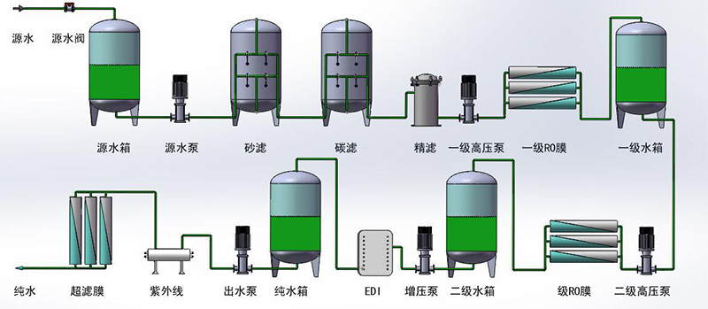 圖二所示是比較高端的超純水機,較圖一增加了雙級反滲透、EDI模塊、紫外光、超濾膜等配件,出水品質(zhì)在所有設(shè)備正常的情況下,可以保證18.2的超純水品質(zhì)。