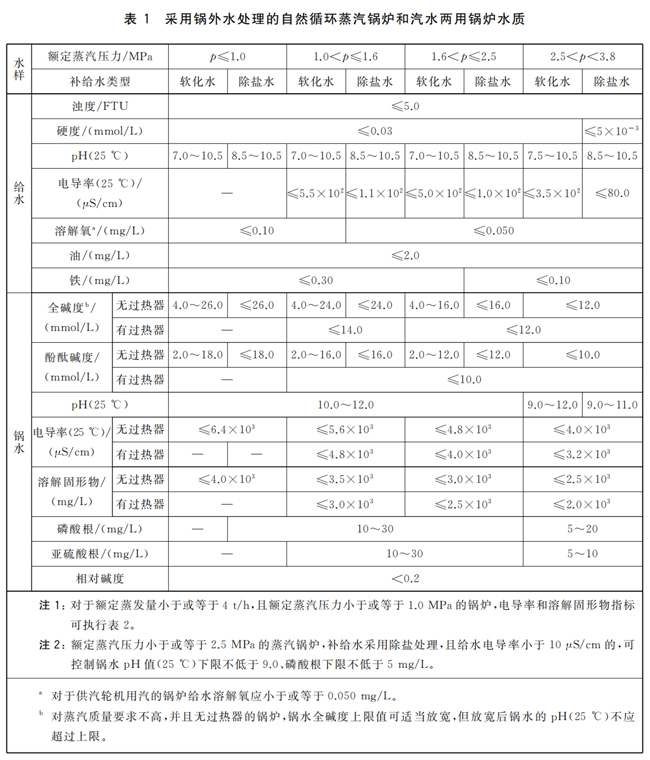 2.1 采用鍋外水處理的自然循環(huán)蒸汽鍋爐和汽水兩用鍋爐的給水和鍋水水質(zhì)應(yīng)符合表1的規(guī)定。