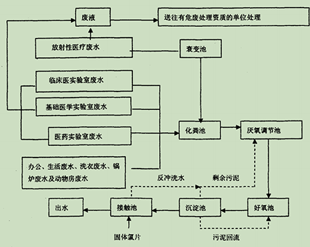 經(jīng)實(shí)驗(yàn)室前端進(jìn)行廢水的分類處理,再根據(jù)廢水廢液的可回收性、危險性交付有資質(zhì)的單位進(jìn)行處理,余下的實(shí)驗(yàn)室廢水可通過實(shí)驗(yàn)室前處理后經(jīng)由排水管道進(jìn)入化糞池,廢水進(jìn)入化糞池與生活污水進(jìn)行混合后,進(jìn)入?yún)捬跽{(diào)節(jié)池進(jìn)行水解酸化處理,由于生活污水可以起到稀釋降解有機(jī)物的作用,可以改善一些難降解性的有機(jī)物。